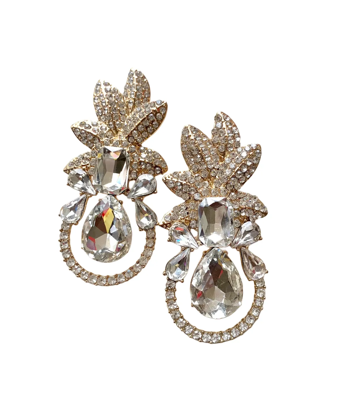 These eye-catching clear crystal and gold earrings offer a unique, tropical design that exude sophisticated glam!